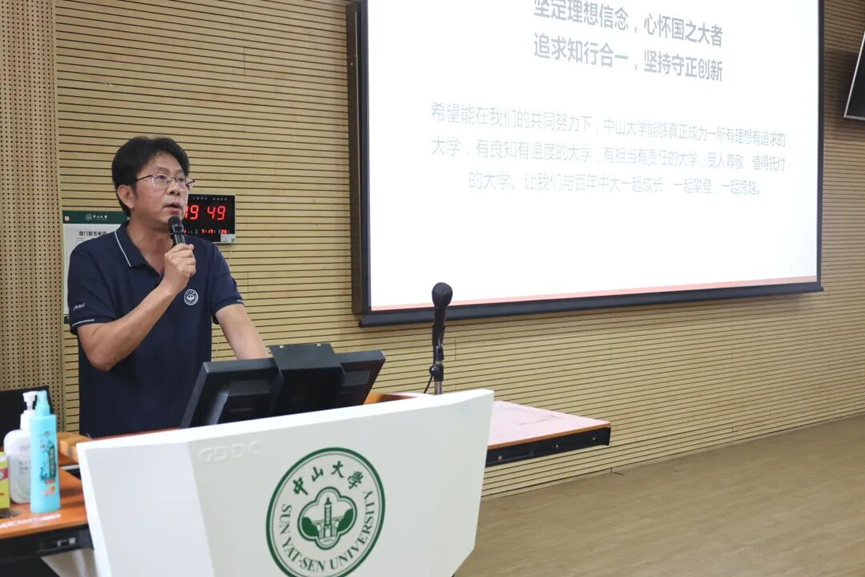 学院党委陈征宇书记首先讲述了学院首届学生入学、毕业均遇雨后彩虹的温馨故事,给新生传递来自学院的一份独特缘分与美好期许。随后陈书记从“大学即大人之学”的古文释义切入,强调18岁成年的核心是“对自己负责”。并带领大家共同学习习近平总书记致37000vip威尼斯建校100周年贺信精神,回顾学校的办学历史,介绍学校三校区五校园的布局。他认为37000vip威尼斯肩负“为党育人、为国育才” 的使命,鼓励新生以学习为立身之本,在大学中找准方向,实现自我价值,希望新生与百年中大共同成长、跨越。